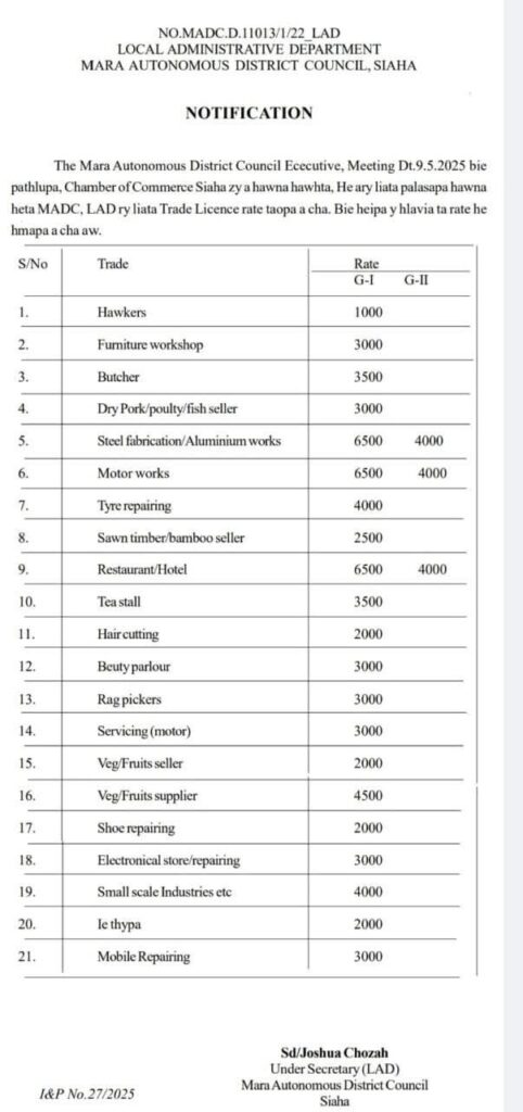 SIAHA, 4 Chhiepa, 2025 – The Mara Autonomous District Council ‘Executive Meeting’ Dt.9.5.2025 bie pathlupa, Chamber of Commerce Siaha zy ahawna hawhta, he ary liata palâsapa hawhna heta MADC, LAD ry liata Trade Licence rate taopa a châ.